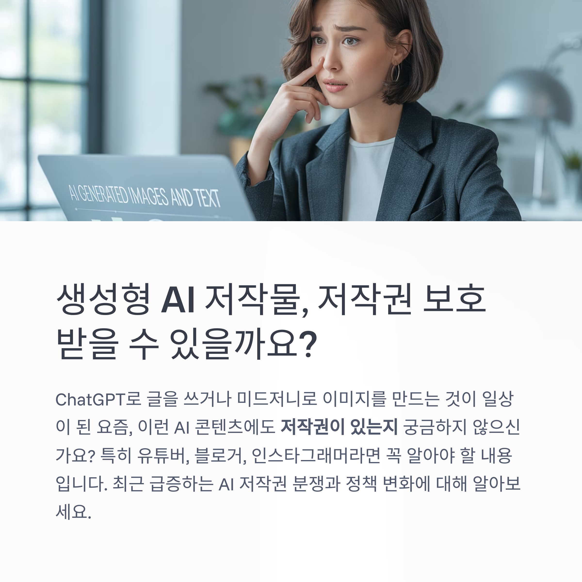 요즘 ChatGPT로 글을 쓰거나 미드저니로 이미지를 만드는 일이 아주 자연스러워졌습니다. 하지만 이렇게 만들어진 콘텐츠도 과연 저작권 보호를 받을 수 있을까요? 특히 유튜버나 블로거, 인스타그램 운영자처럼 콘텐츠를 직접 제작·공유하는 분들에게는 이 문제가 남의 일이 아닙니다.