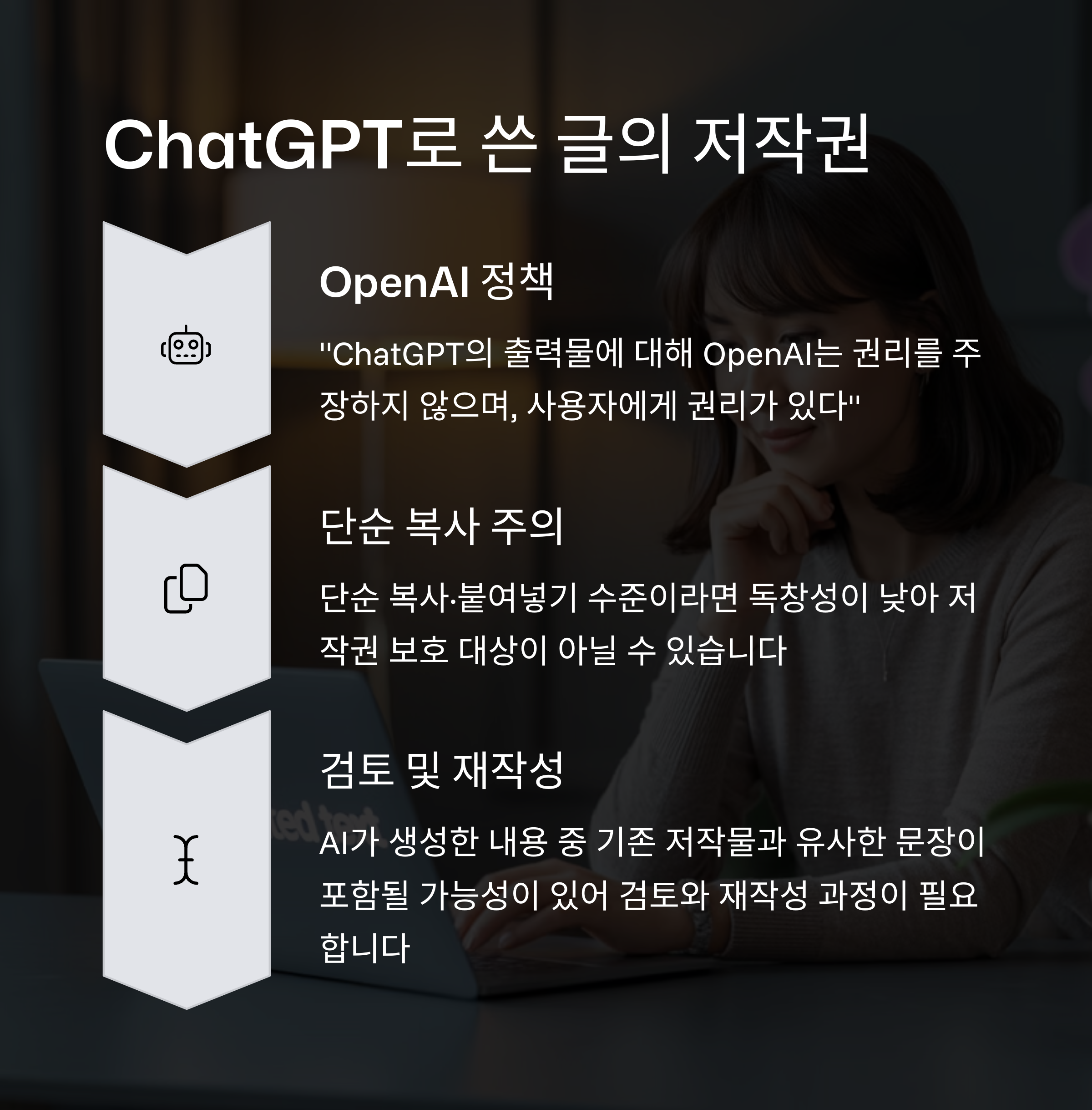ChatGPT로 쓴 글, 저작권은 누구에게 있을까? 블로그 글이나 보고서를 ChatGPT로 작성한 경우, 그 결과물은 대부분 사용자에게 귀속된다고 해석됩니다.