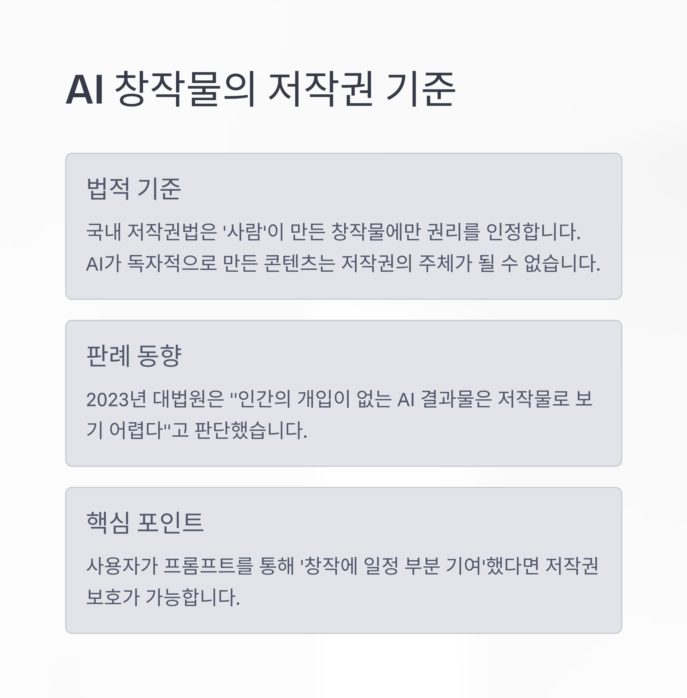 AI가 만든 창작물, 저작권 보호 받을 수 있을까? 기본적으로 국내 저작권법은 ‘사람’이 만든 창작물에 한해 권리를 인정하고 있습니다. 즉, AI가 독자적으로 만든 콘텐츠는 현행법상 저작권의 주체가 될 수 없습니다. 2023년 대법원 판례에서도 생성형 AI 결과물에 대해 "창작성이 인정되더라도 인간의 개입이 없다면 저작물로 보기 어렵다"는 판단이 나왔습니다.