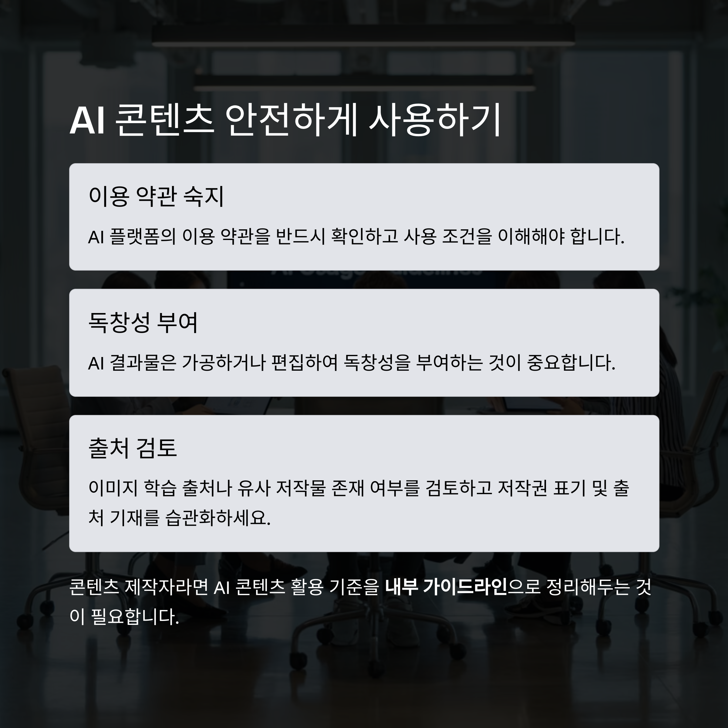 특히 콘텐츠 제작자로서 다양한 채널에서 활동 중이라면, AI 콘텐츠 활용 기준을 내부 가이드라인으로 정리해두는 것이 필요합니다.