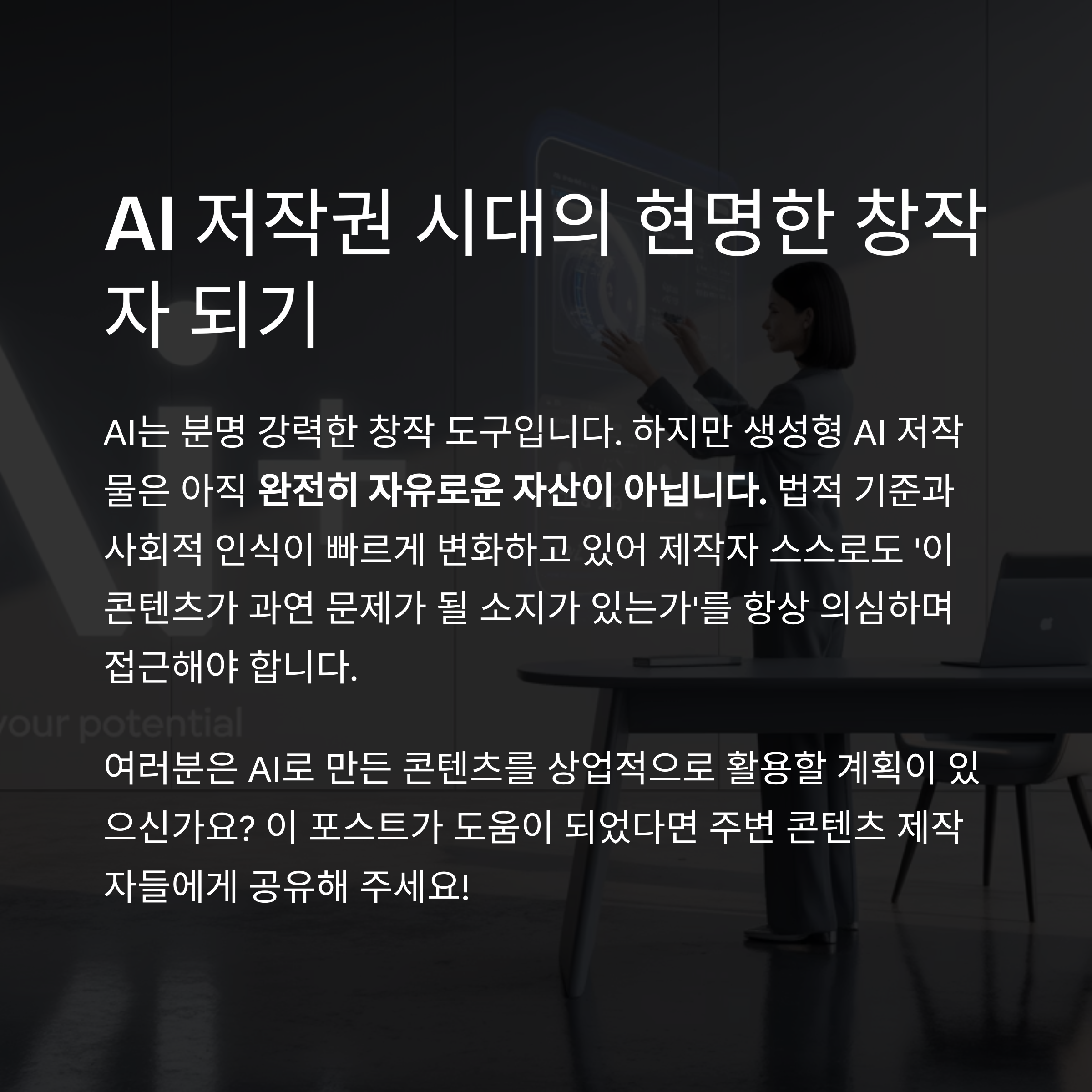 AI는 분명 강력한 창작 도구입니다. 하지만 그만큼 법적 기준과 사회적 인식도 빠르게 변화하고 있습니다.